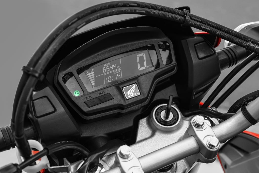 O painel é de LCD Blackout digital com conta-giros, velocímetro, hodômetro total e parcial, indicador do nível de combustível e luzes-alerta. Idem o farol dotado de refletor multifocal e resistente lente de policarbonato.